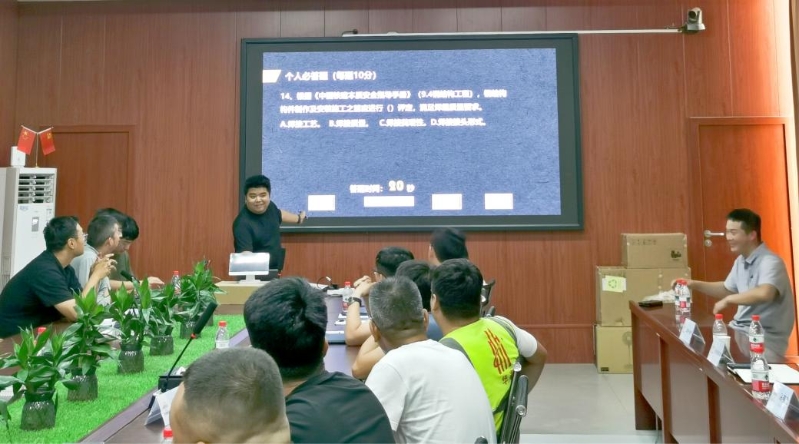 投影上展示的“百錯(cuò)圖”就像一塊磁鐵,牢牢吸引現(xiàn)場參賽選手的目光。大家爭搶著發(fā)言,指出圖中存在的安全隱患,現(xiàn)場氣氛越來越熱烈,為接下來的“安全擂臺賽”做熱身活動。工地項(xiàng)目部辦公室簡單布置一番,就變成了比拼安全知識的擂臺;項(xiàng)目專職安全員和安全總監(jiān),則臨時(shí)客串“安全擂臺賽”主持人和評委。